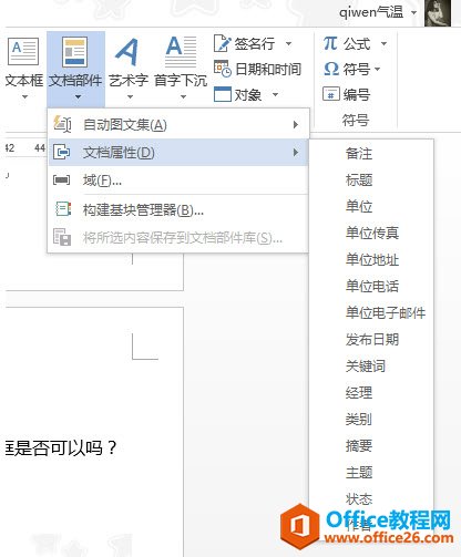 点击“插入-文档部件-文档属性“,里面可以看到Word系统自带的标记文本框。