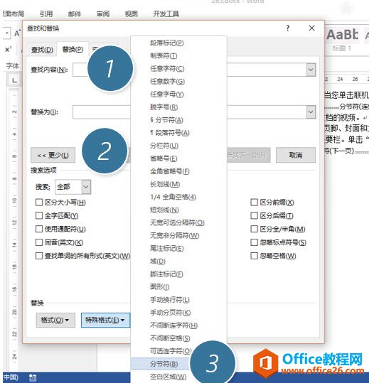 按Ctrl+H打开替换窗口,首先将光标放置于查找内容处。(下图 1 处),然后点击“更多”(下图 2 处,点开后变成“更少”),然后选中“特殊格式”中找到底部的“分节符”。(下图 3 处)