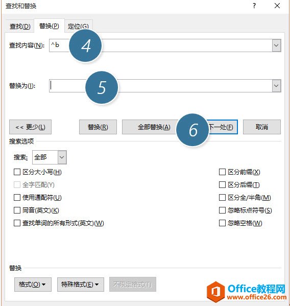 这是能看到有个 “^b”标记的编码(下图 4 处),以后你熟练的话可以直接输入这个编码,不要告诉我你不会输入“^”符号(shift+6搞定)。接下来就简单了,保持替换为空,所谓空就是什么都不输入。(下图 5 处),接着就按“全部替换”搞定。(下图 6 处)