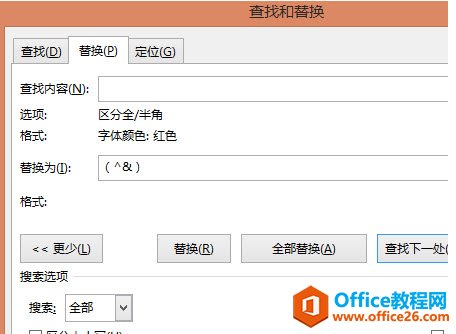 就是将红色的部分替换成红色加括号的设置。注意^&表示代替查好内容的设置。本例查找内容为红色字体。