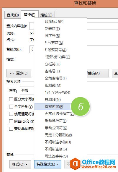 然后在“特殊格式”处,单击“查找内容”按钮。(下图6处)