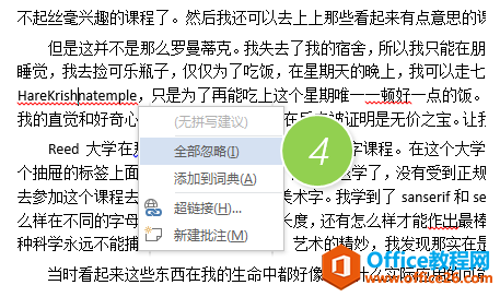 总结:有时候的特殊操作,需要去除波浪线。按上面设置,将所有的文档将不会判断。但是有还是需要这个功能,只是临时某个文档不显示波浪线,则可以用鼠标右键忽略的方法搞定。(看下图4处)