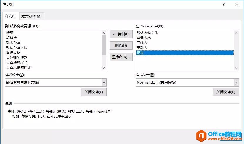 技巧提示:点击【文件】-【选项】命令,打开【Word选项】对话框,选择“加载项”选项卡,在“管理”下拉列表中选择“模板”,点击“转到”按钮,在打开对话框的“模板”选项卡中单击“管理器”按钮,也可打开“管理器”对话框。(2)打开“管理器”对话框,选择“样式”选项卡,这里如果在打开对话框之前已在Word中打开了文档,那么在“样式”选项卡左右两侧的列表框中将会显示当前文档与其所引用的模板中包含的样式。