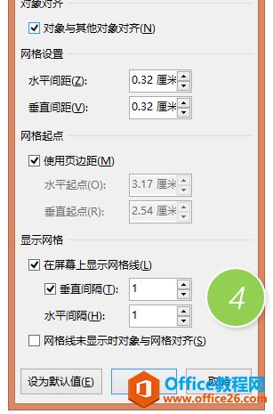 在新弹菜单中,打勾在“在屏幕上显示网格线”,并设置垂直和水平间隔,本例设置为1.(下图4处)
