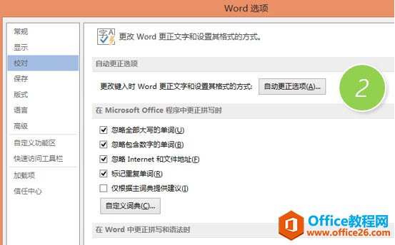 在文件-选项中,单击校对,单击“自动更正选项”。(下图2处)