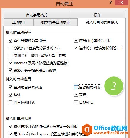 在新弹窗口中,选择“键入时自动套用格式”选项卡,去掉“自动编号列表”前的勾。这样你再敲回车,编号就不会变成自动编号了。