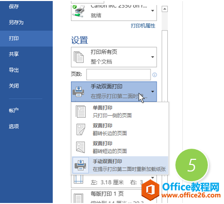 总结:双面打印就是分两次进行打印,先打奇数页后打偶数页。当然如果你怕出错,Word还提供中手工双面打印法,就是一张一张的双面打印,这个效率嘛就低点。具体设置看下图。(下图5处)
