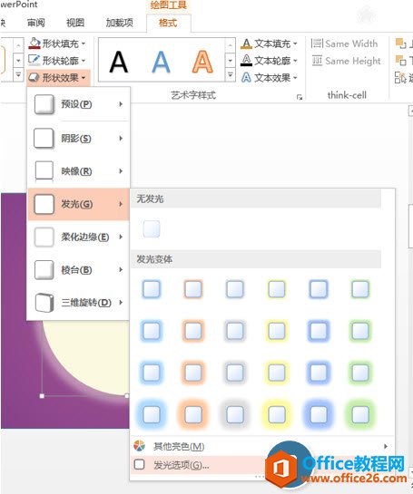 接下来我们需要这个月亮得朦胧起来,不然这个中秋的月亮能“够亮”呢?很简单加上一个光晕就好了,方法如下,选中月亮,然后在“格式-形状效果-发光-发光选项”(下图2处)进行设置。