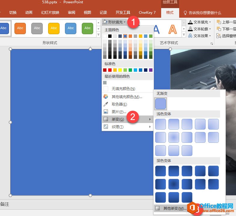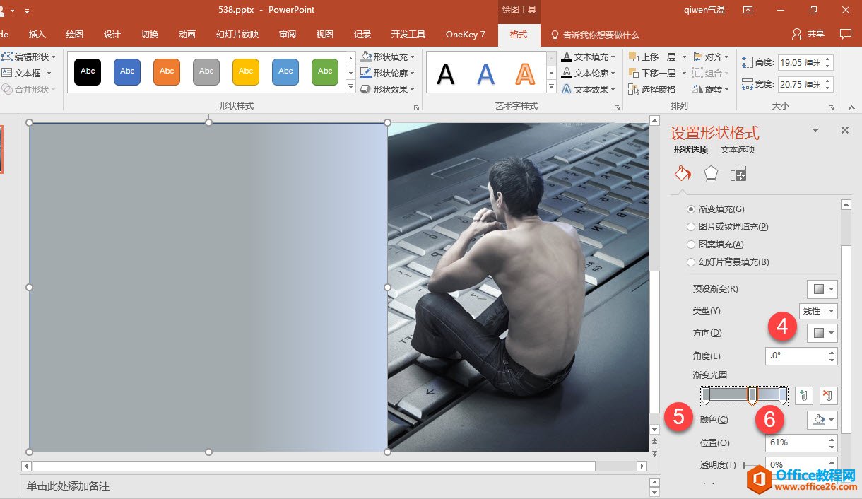 在下图4处,方向设置为渐变向右,将5和6的颜色设置为图片所带的颜色。(用取色器取色即可,必须Office2013版本以上)