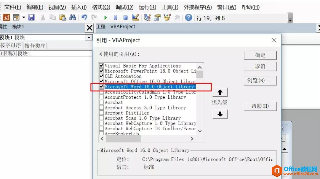 3、之后我们在相应的界面中找到类型为“Microsoft Word 16.0 ObjectLibrary”,点击确定。