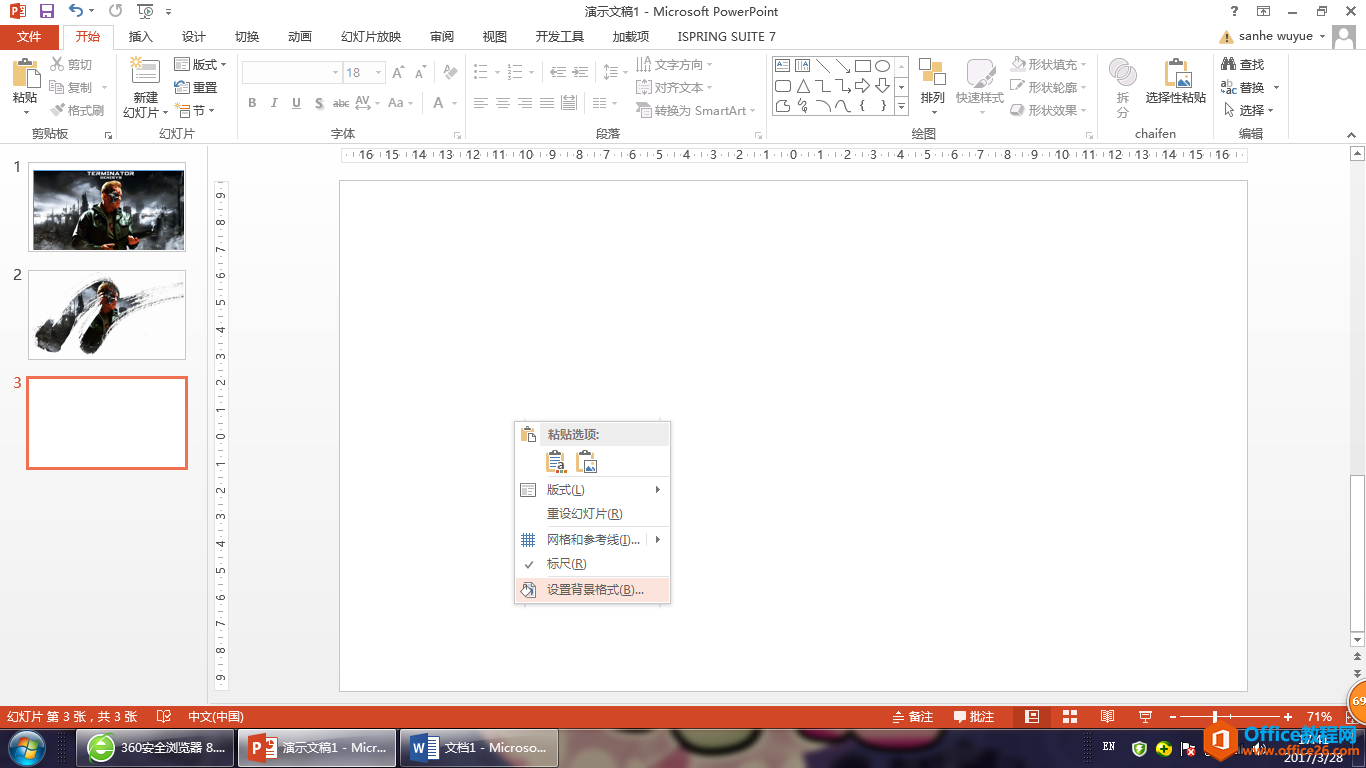 第二步,在幻灯片空白地方右击鼠标,然后选择“设置背景格式”选项