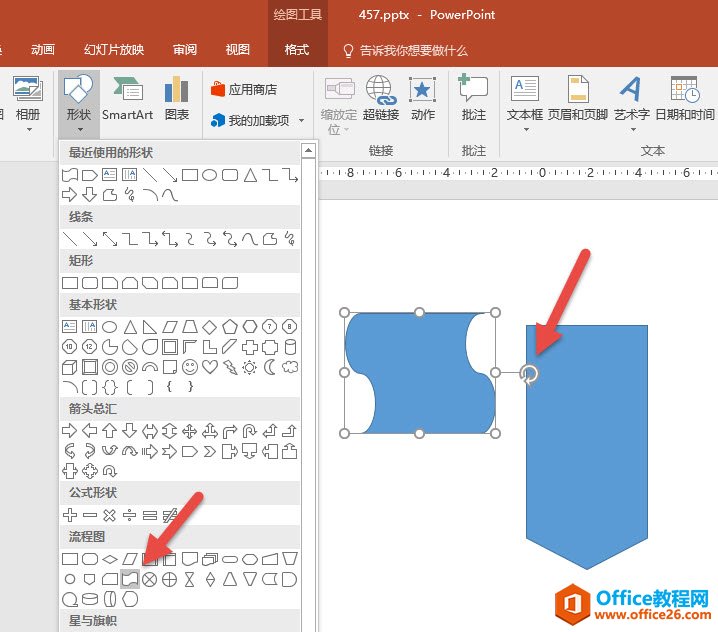 接着好玩了,插入一个不太经常用到的图形,他叫—流程图:资料带
