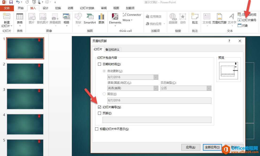 点击“插入—幻灯片编号—幻灯片编号”,点击“全部应用”。