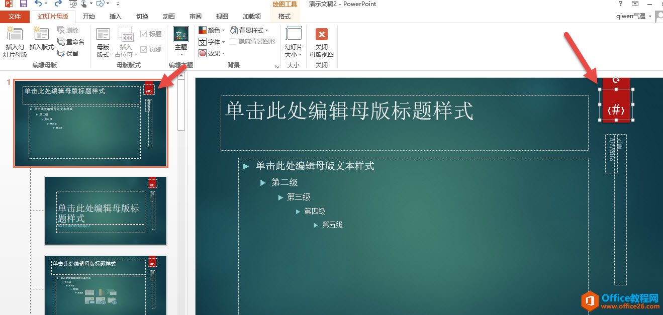 点击“视图-幻灯片母版“,找到第一个”主题母版”,看到下图中带#号的文本框,这个文本框就是页码编号的占位符,移动该文本框,即可调整页码编号的位置。