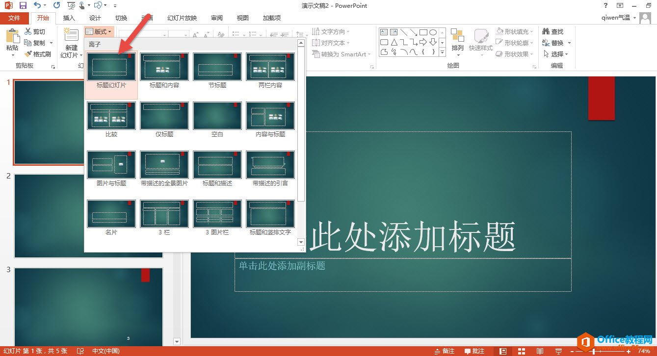 但还没有完,一定PPT的第一页是“标题幻灯片“版式,才能生效。