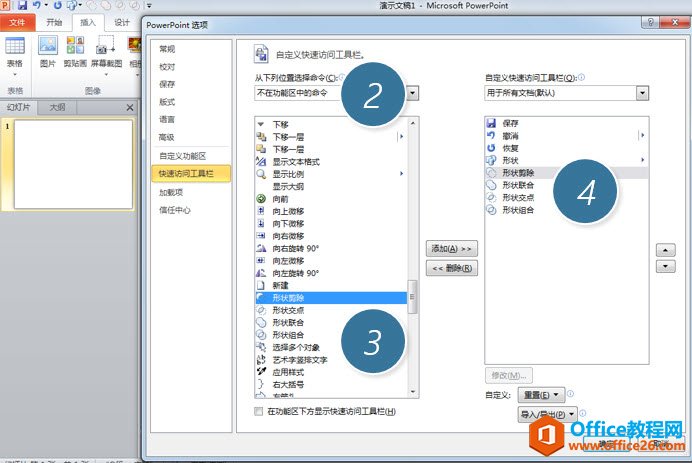 接下来利用PPT2010的图形相交功能搞定。PPT2010的图形相交功能是一个“隐藏”功能,需要利用自定义QAT工具栏打开。