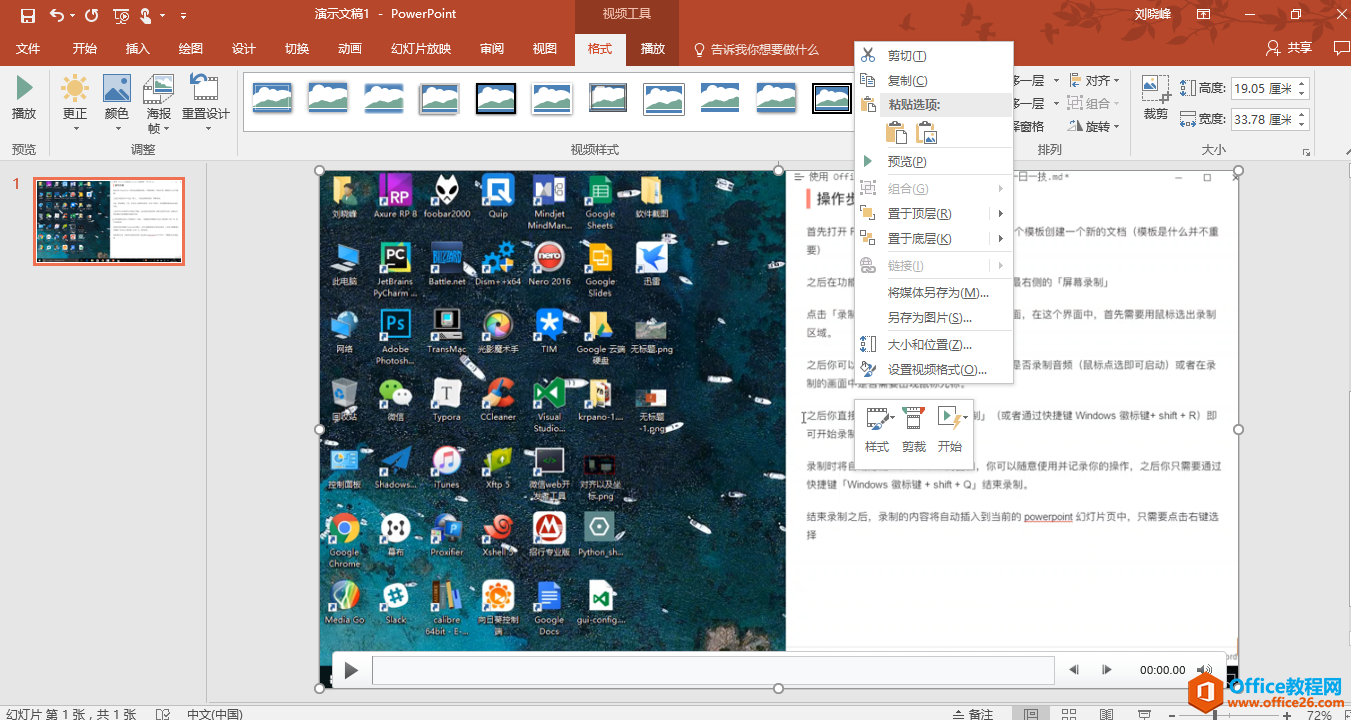 右键可以对录制的内容进行进一步操作 5. 结束录制之后,录制的内容将自动插入到当前的 PowerPoint 幻灯片页中,点击右键可以选择直接在 PowerPoint 中对视频进行简单的剪辑,也可以直接保存为媒体文件方便进一步的处理。