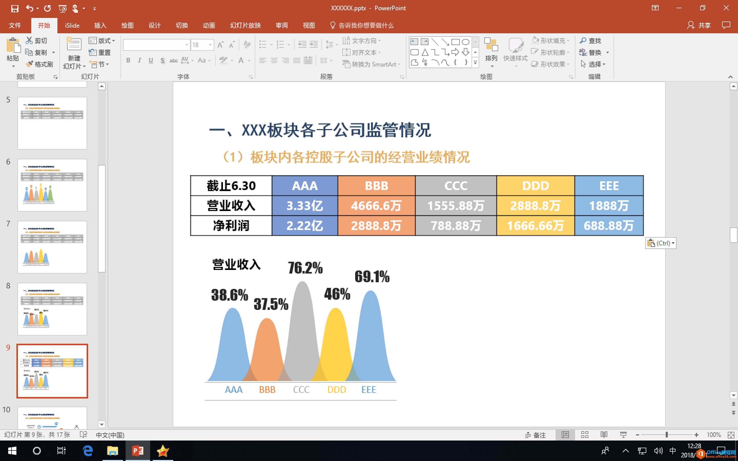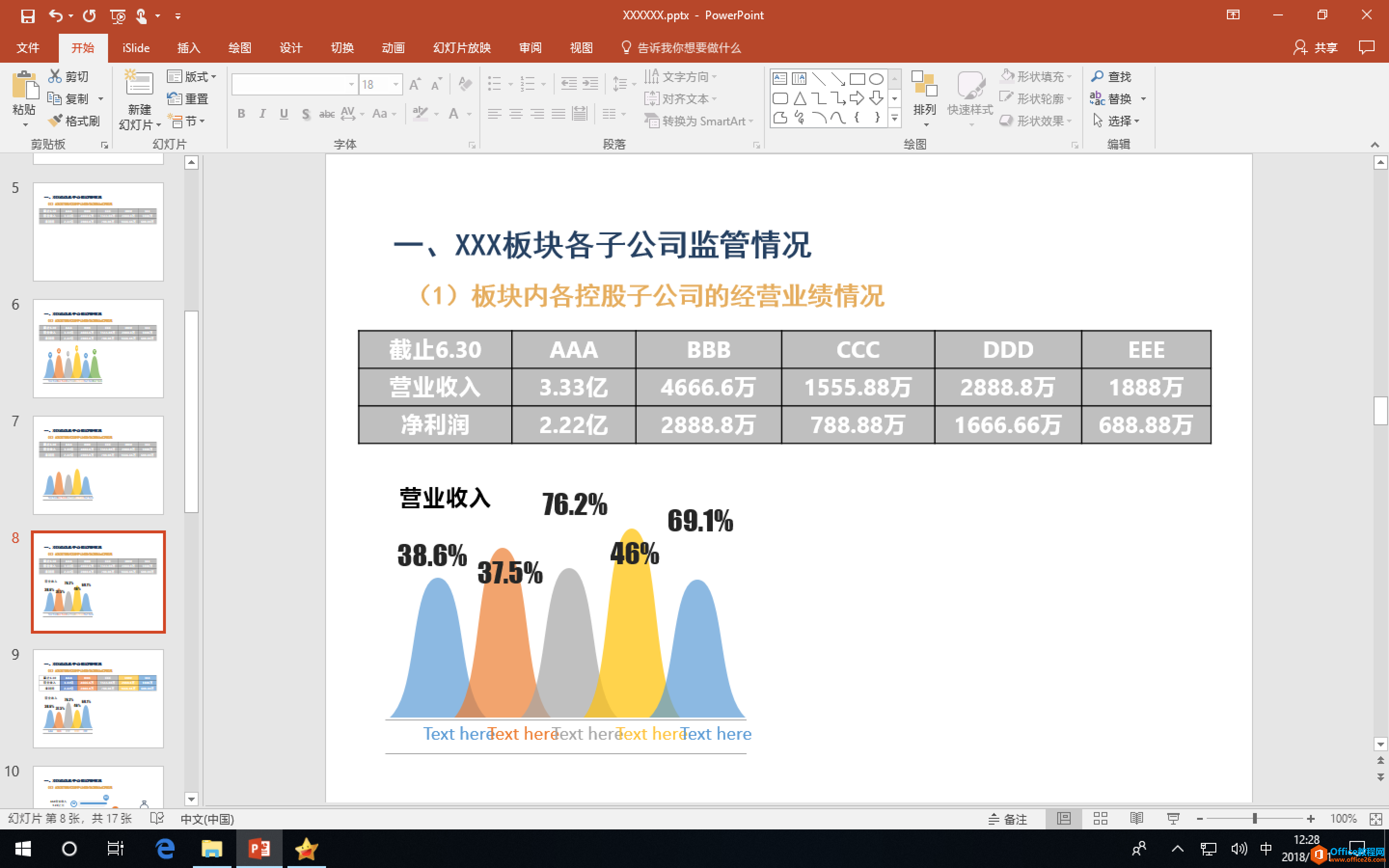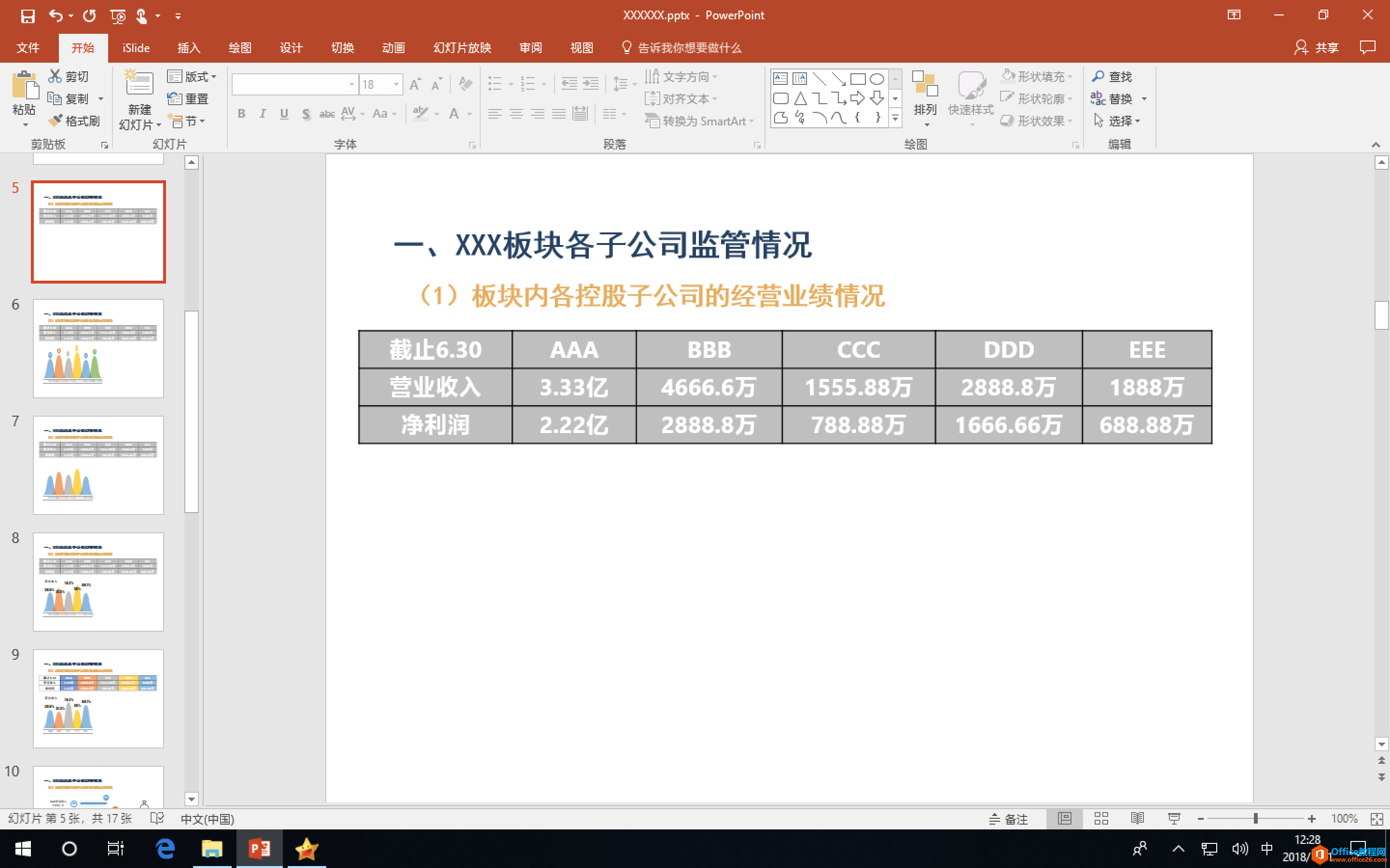 我所在的公司是一个集团,我部门负责多家子公司的生产经营,因此展示经营报表数据是 PPT 中比较重要的一页。比如展示五家子公司半年度营业收入、净利润和目标完成情况,可以怎么做呢?