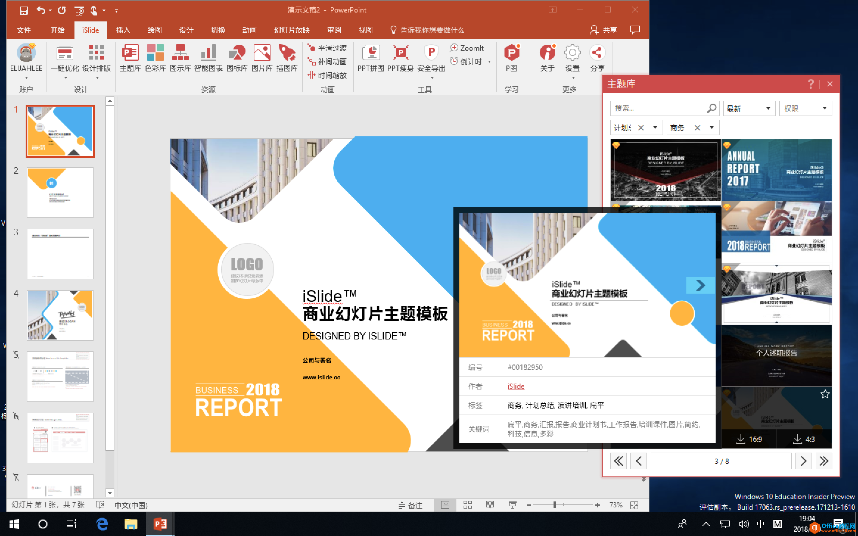 iSlide 所有素材库都支持多种条件的筛选,主题库中,我们可以选择「计划总结」分类、「商务」风格,我认为 #00182950 就是一个比较好的选择(当然见仁见智啦)。哦对了,你可以直接在搜索框中输入这个编号查找。