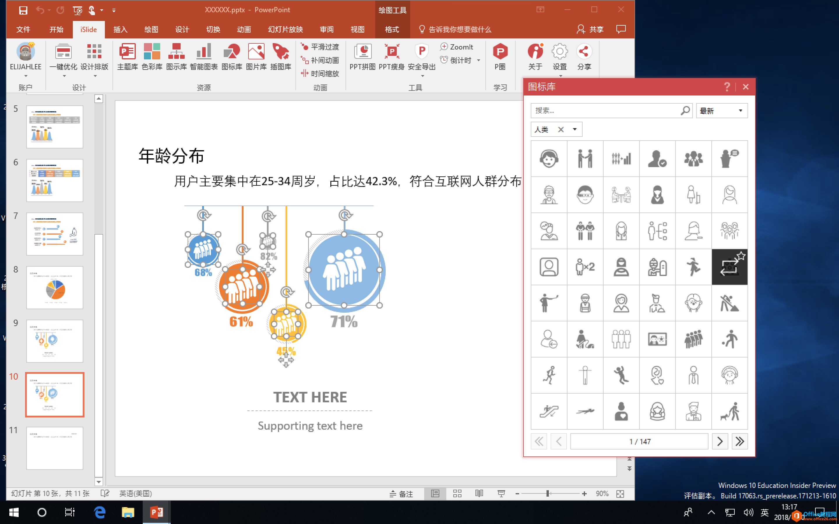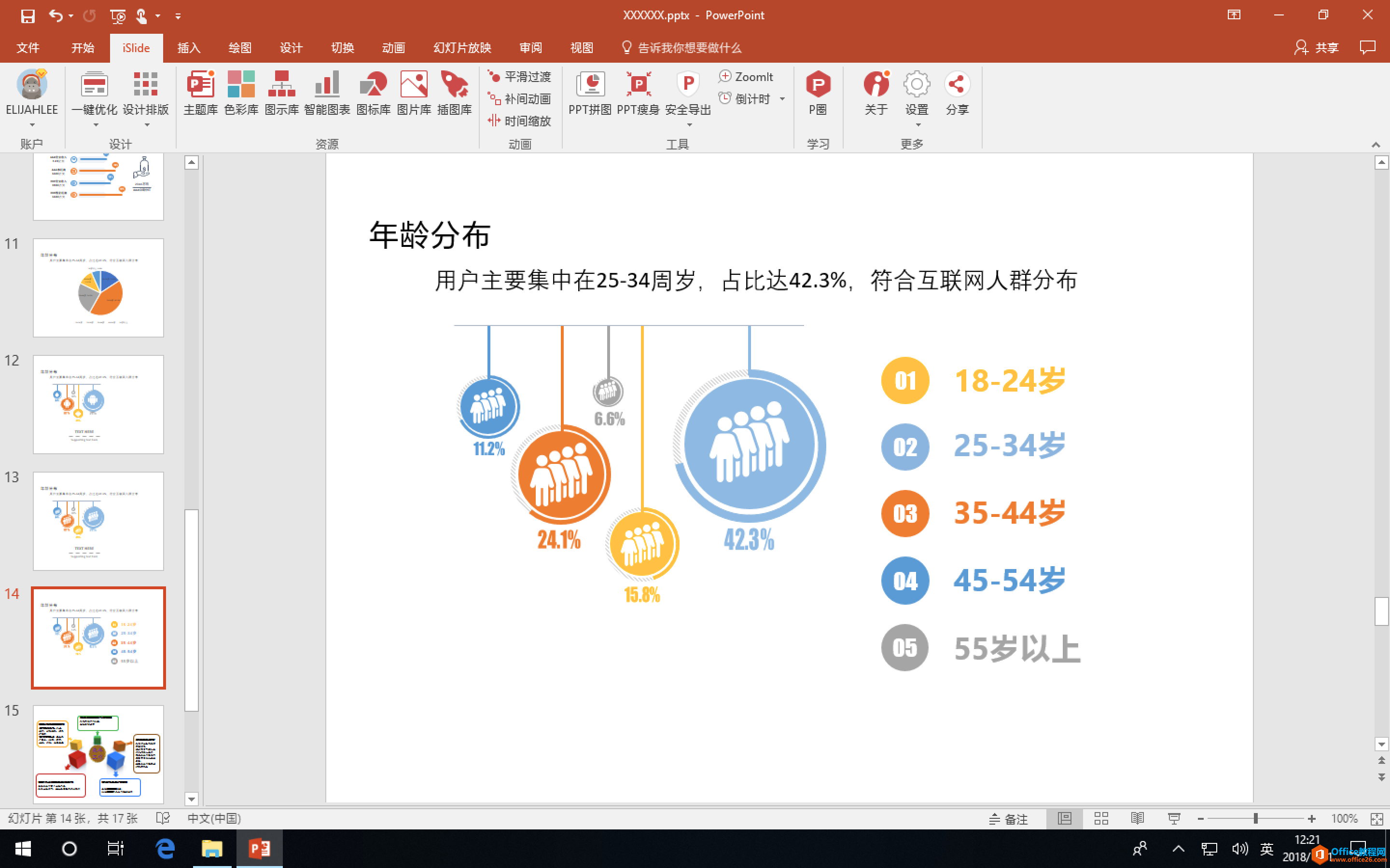 再接下来,我们只要修改百分比数据,再用「图示库」的 #00001077 把年龄段显示就可以了。百分比数据越大,图标也越大,直观也美观。