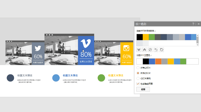 如果你不知道该选什么配色,那么直接使用 iSlide 标准色,再选择「应用到全部页面」就可以了。