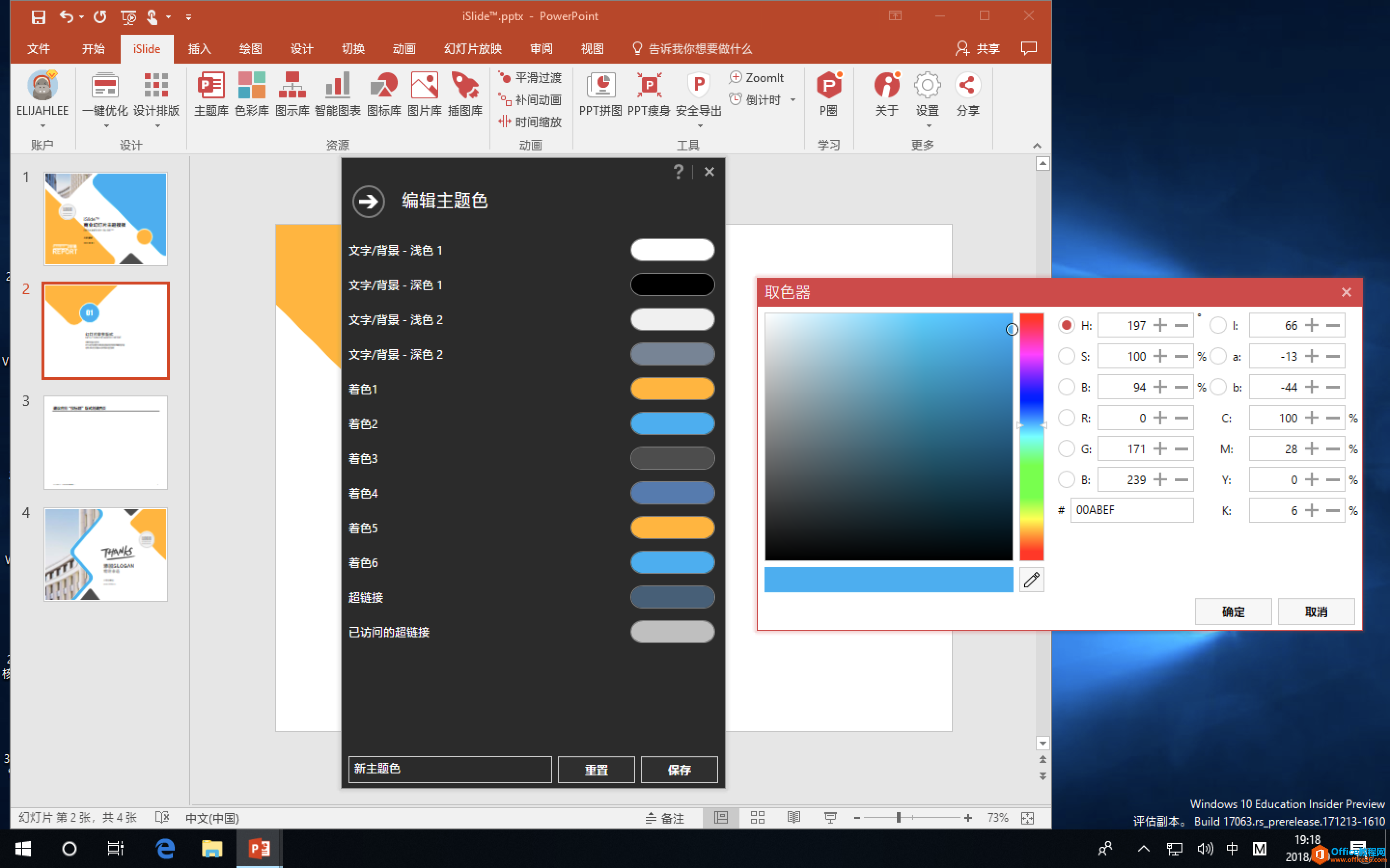 像 #00182950 主题就有非常明确的配色,这对于不太精通色彩选择的用户,是非常友好的。蓝色和黄色成为了主要色调,除此之外,我们最好先定义整个 PPT 的所有配色。