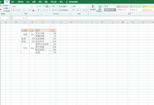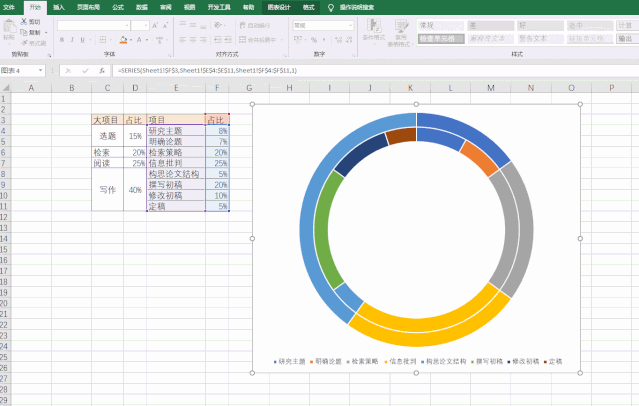 第一步,选中E3:F11区域插入环形图,动图操作如下:
