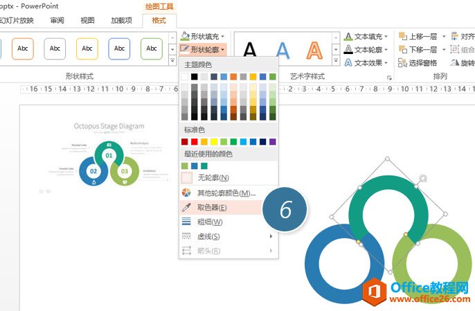 接着去除轮廓线,然后利用取色功能将三个图形分别取成样图的颜色。(下图 6 处)PPT2013版本可以用第三方取色软件来获取图形的RGB码。