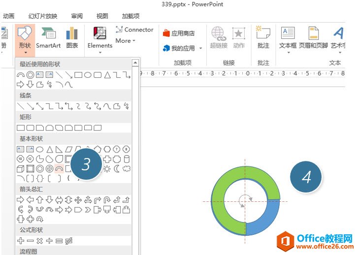 再复制一个同心圆出来,然后在同心圆的基础上插入一个“空心弧”(下图 3 处),将其调整到如下角度(下图 4 处)。注意空心弧的宽度与同心圆的宽度相同。