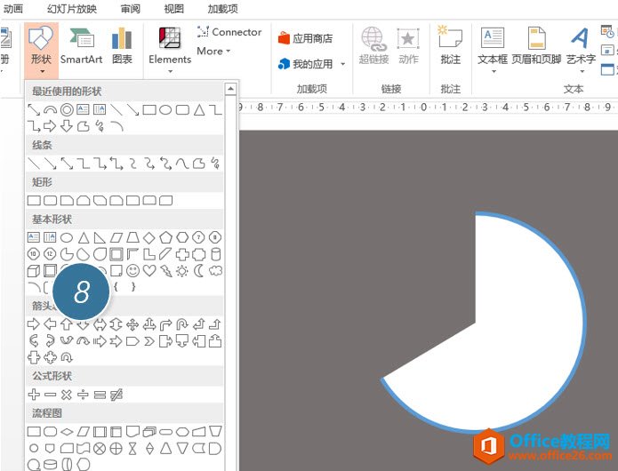 总结:又一个典型的图形组合的案例,大家可以在这图形组合的基础上发挥自己的创意,玩出更有助于PPT核心思想表达的图形。这需要的注意的是如果利用弧形(下图 8 处)工具,可以直接做出不需要遮挡轮廓的方法,这里提示如下: