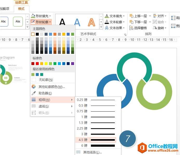 注意观察后会发现,似乎是这个空心弧设置了白色轮廓线?赶紧来设置看看,将其轮廓线设置为白色,粗细为4.5磅左右。(下图 7 处)