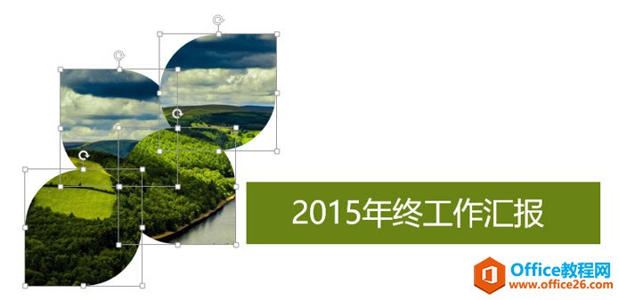 相信这个操作到这里大家都会吧。可以所谓创意就是那么一些小小的变化。我们只要拖拽其中几个泪滴调整到合适的位置。比如按下图进行部分重叠,然后在旁边加上一个图形框,写上PPT的标题,一个不错的PPT封面设计就搞定了。注意图形框是吸取了泪滴上图片的颜色。