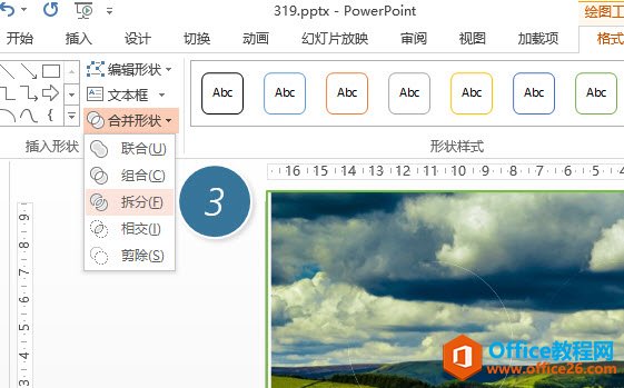 关键的一步,先选中图片,在选中泪滴图形,然后点击“绘图工具-格式-合并形状-拆分”按钮。(下图3处)