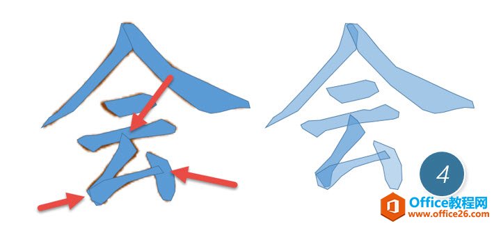 以此类推,在进行描边的时候,注意笔画之间的相互遮挡,注意下图左的红箭头所指的位置,如果看不明白,也可以看右边的透明笔画的表达,注意他们的重叠位置。(下图4处)