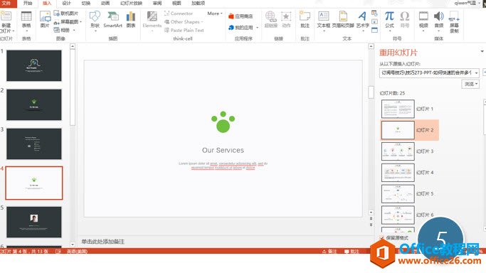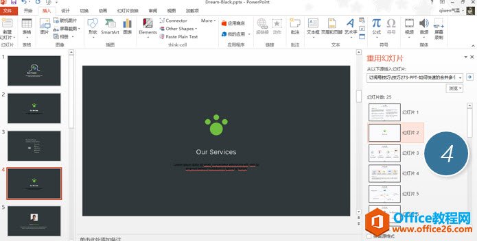 右侧则会显示新加载的幻灯片,如下图4处所示,点击幻灯片2就会插入到左侧的幻灯片里,当然也鼠标右键试试一次性把所有幻灯片插入。但这里需要注意的是插入的幻灯片会使用被插幻灯片的主题,在本例看来也就是变成黑灰色。那如果想保持右侧原有的PPT风格该怎么办呢?请往后看。