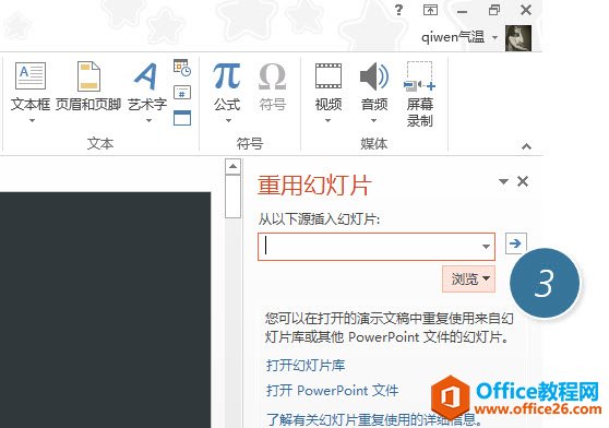 接下来好办了,在右侧的重用幻灯片中,浏览加载Dream-White.pptx文件。(下图3处)