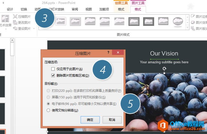 去掉“仅应用于图片”(下图 4处),就表示将裁剪压缩群里的所有图片。系统会自动选中“电子邮件”选项。(下图5处)