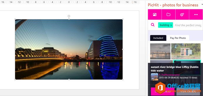点击“插入-应用商店”按钮,在新弹菜单中选择“插入图像”按钮。选择下图粉色的插件:photos for business.(下图2处)