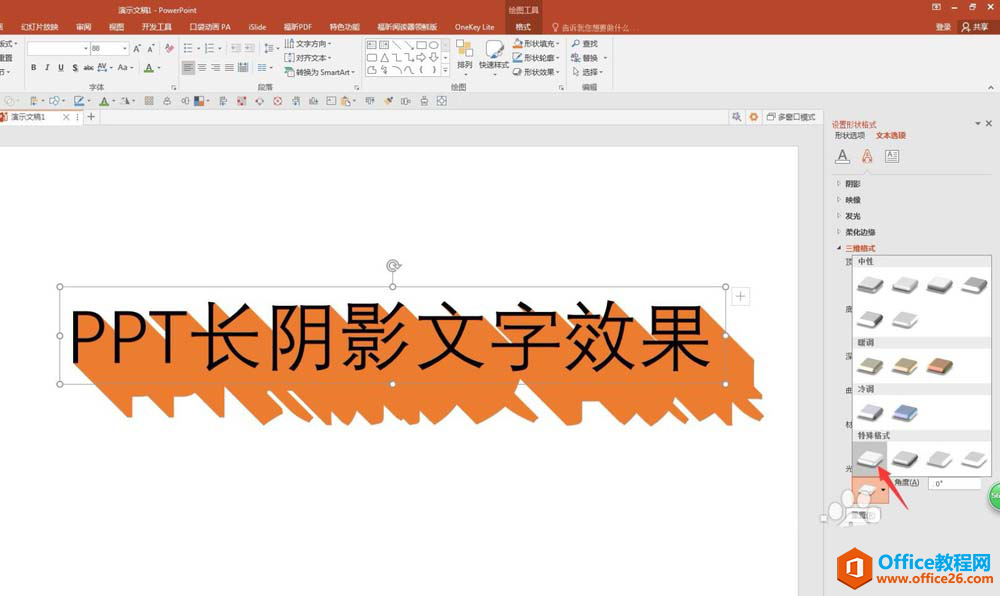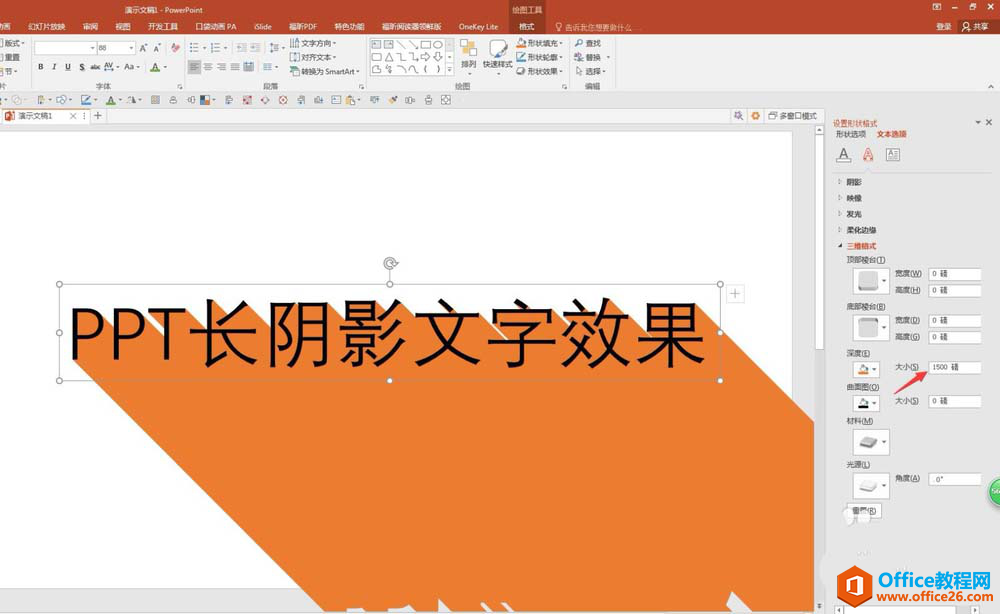 7、根据文本框的文字大小和摆放的位置,全屏预览长阴影是否完善,否则继续设置“三维格式”中的“深度”,反复预览,直到效果满意为止。