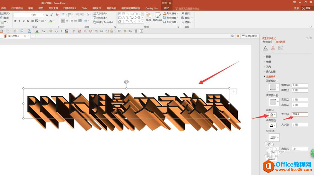 5、点击打开“三维格式”,在“深度”中选择一种颜色,“大小”暂时设置为300磅。得到了初步的效果。