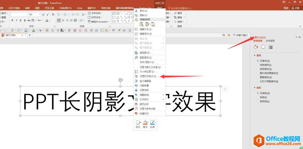 2、右键单击文本框,选择“设置形状格式”,在右侧就会打开形状格式设置窗口。