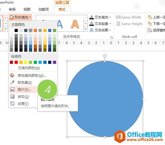 删除图片,然后选中圆形,在形状填充中选择“图片”按钮。(下图4处)