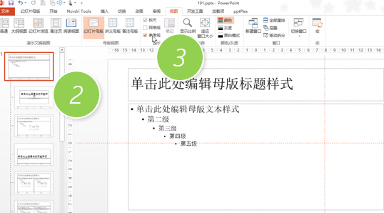 点击"视图-幻灯片母版"(下图1处),进入幻灯片母版。
