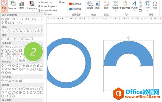 首先按住shift键在PPT插入同心圆。(下图1处)