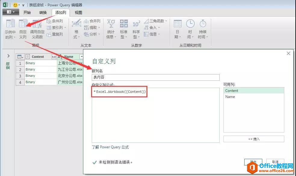 在Power Query编辑器界面中,选择【添加列】页签–点击【自定义列】按钮–在弹出的【自定义列】对话框汇总–输入一个自定义的列名称,如【表内容】–在下方的公式区域中,输入:
