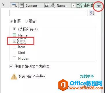 在创建的新【表内容】列,点击展开按钮–选择【Data】项,即,准备将表格中的数据内容进行展开。