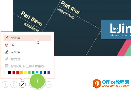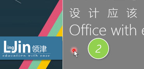 这里需要注意的是PPT2013支持一种新的“笔”显示方式:激光笔。如下图2处所示。