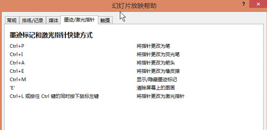 那就是在PPT播放状态下,按F1键,PPT会弹出所有的播放时候的快捷键菜单。然后切换到“墨迹/激光指针”选项卡就可以看到对应的快捷键了。