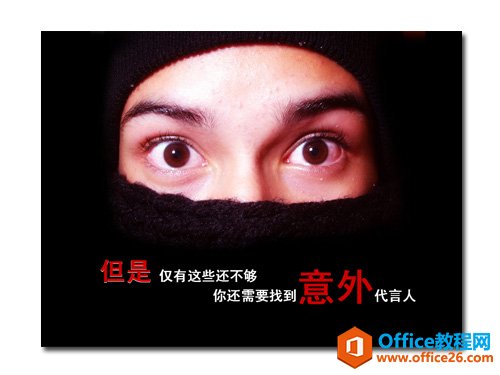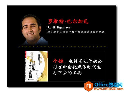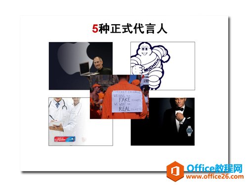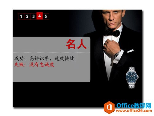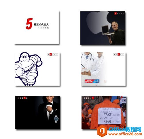 1)创始人的图片找了苹果乔布斯的,角色的图片是米其林的轮胎人,权威则是高露洁最喜欢的医生,名人是棒.真是棒为欧米茄的代言,最难处理的是爱好者,最后挑了一张荷兰球迷的。对图片的理解和选用是基于对行业的熟悉,选用这样的图片,听众一看就明白图片代表的含义,跟着将含义转化成文字,这就是图片的好处:不是直接灌输,而是让听众自己想出答案,这远比直接的文字印象深刻。2)这里我用了数字线,每页突出当前数字,这个方法有人也提出过不好,不过我认为还是可以的,可以让听众了解当前讲解的顺序,因为PPT是直线型的,容易迷航。3)文字的处理,大图少字似乎是潮流了,如果你在PPT上写了很多字,一定是会被认为外行,当然也不是绝对的。但是中国有中国的现实,单纯的图片不一定会被认可,所以这里用了一个简单动画,单击时候可以出现文字。这样由演讲者自己掌握什么时候让文字出现作为辅助讲解,同样,在你对某张图片讲个故事也好,阐述也好,完了之后文字页可以起个补充和说明的作用: