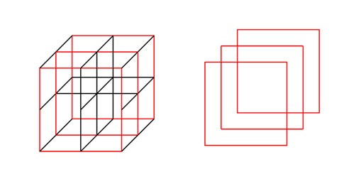 如果试着将黑色的线去掉,不过是3个正方形而已嘛。将3个正方形用线连接起来,再在每个正方形的中间画上线,就组成了一个复杂的魔方形立方体了(魔方本来就是一位教授为培养他建筑系学生的空间感而发明的)。接下来就可以做实际练习了。